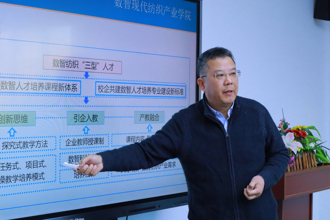 金子敏教授汇报校级产业学院——数智现代纺织产业学院建设情况。他介绍产业学院通过建立政产学研协同发展的共同体,发挥数字化纺织产业优势,深化产教融合,重点在纺织品数字化设计、纺织装备互联互通、纺织企业数字化管理、数字化智能化纺织产品开发等领域,培养数字化纺织产业需要的高素质应用型、复合型、创新型人才。