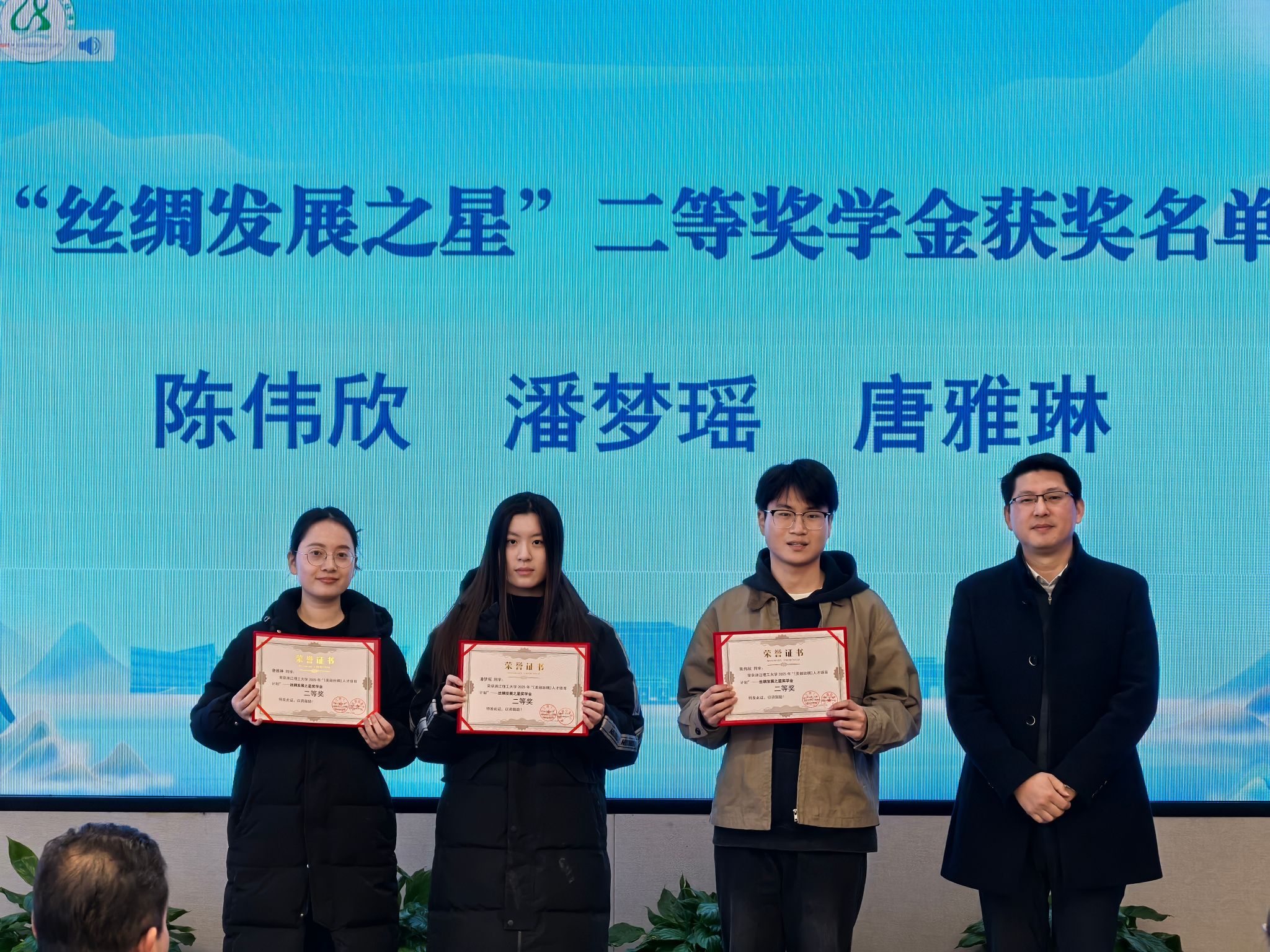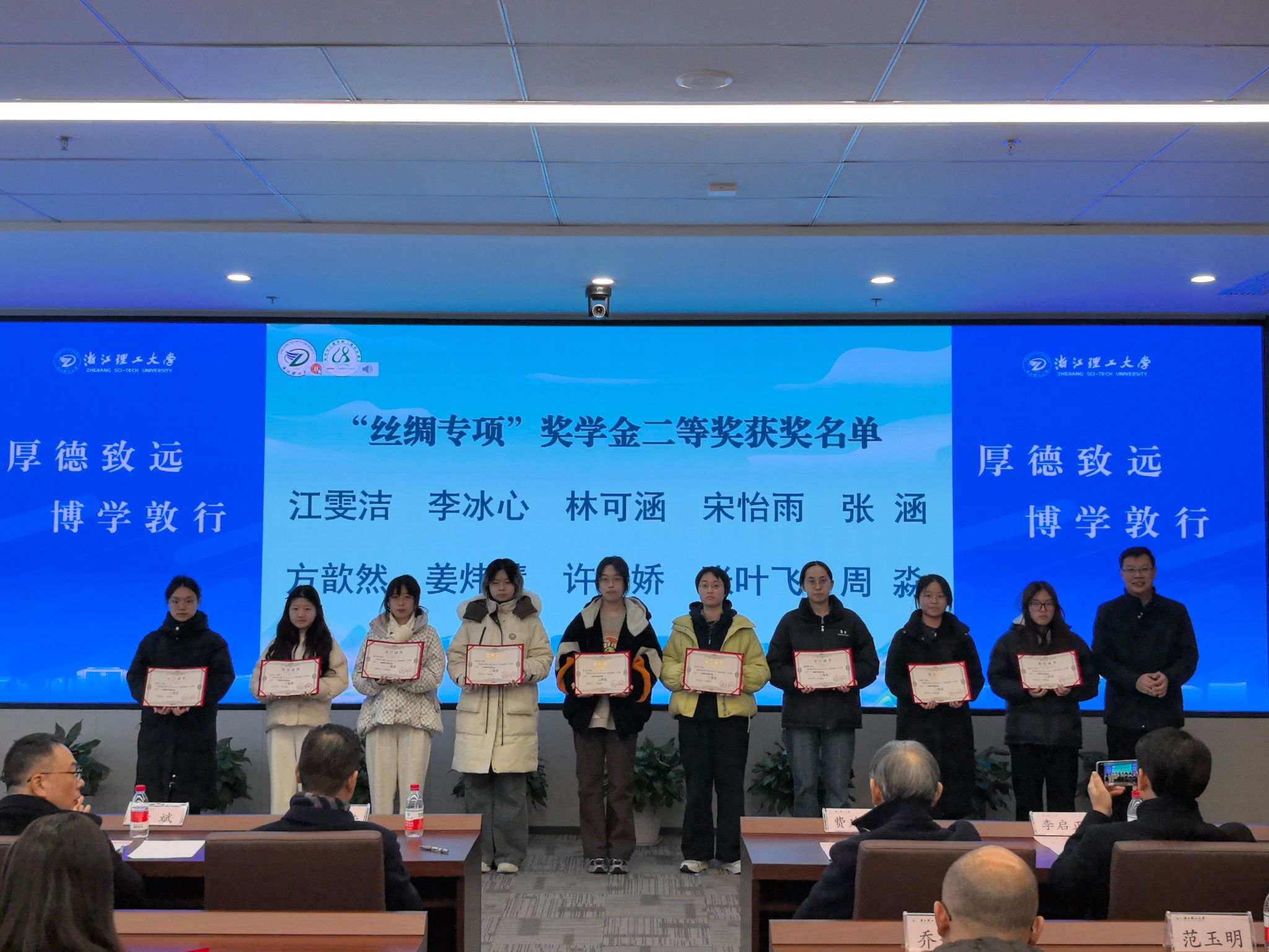在热烈的掌声中,“美丽丝绸”奖学金颁奖仪式正式举行。本届奖学金设“丝绸发展之星”和“丝绸专项”两个类别,共有38名优秀本硕博学生获奖。