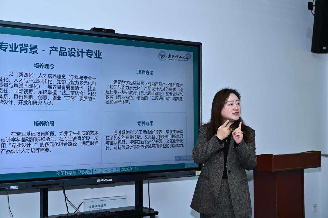 在2026级本科人才培养方案论证会环节,纺织材料系副系主任李妮、非织造工程系主任李祥龙、纺织品(丝绸)设计系主任鲁佳亮分别汇报了各专业人才培养方案的修订思路、主要变化与改革举措。