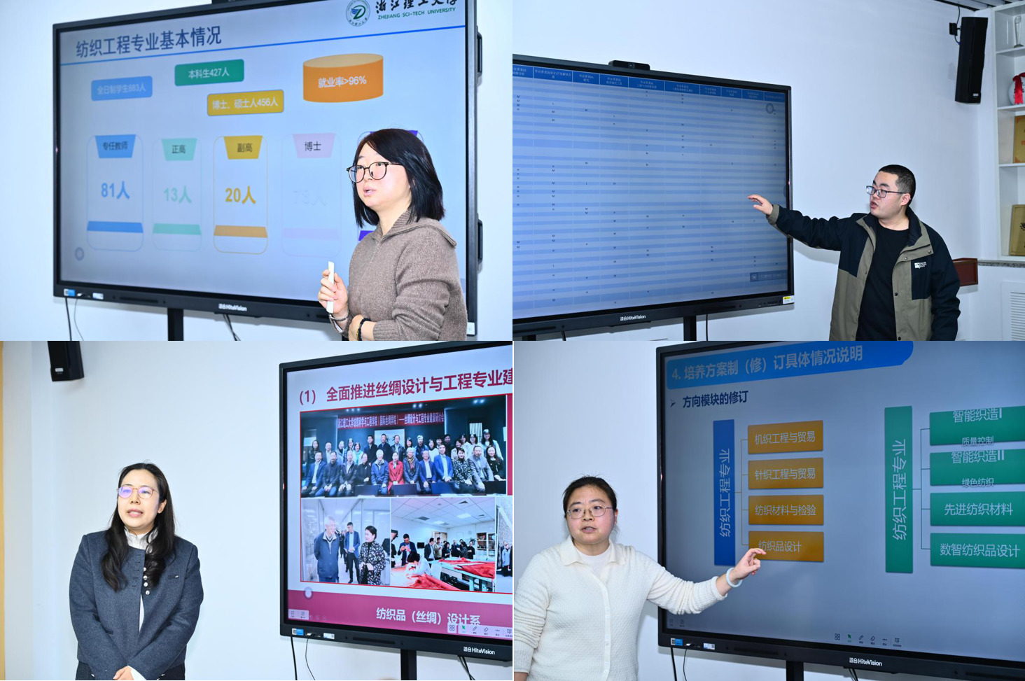 在国家级一流本科专业建设研讨会环节,纺织工程系主任田伟、非织造工程系主任李祥龙、纺织品(丝绸)设计系主任鲁佳亮分别围绕各专业的发展现状、建设举措、特色成效及未来规划作了系统汇报。
