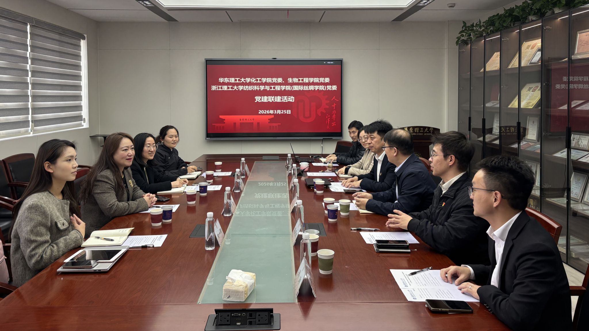 3 月 25 日下午,为探索党建与“登峰学科”建设深度融合新路径,纺织学院(丝绸学院)党委书记苏淼、党委副书记、纪委书记张孝凤一行赴华东理工大学化工学院、生物工程学院开展学习调研。化工学院党委书记段学志、生物工程学院党委书记程家高、化工学院党委副书记孙莉等参与座谈,座谈会由生物工程学院党委副书记孟庆鹏主持。